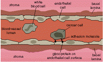 . Cancer cells that survive the trip through the bloodstream can adhere to the blood-vessel wall in an organ distant from the original. Integrins and other adhesion molecules produced by the cancer cell are likely involved in this adhesion.