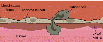 . Once adhered to the blood-vessel wall of a new organ, the metastatic cancer cell pushes endothelial cells aside, digests the basal lamina and invades its way out of the blood vessel and into the new organ.