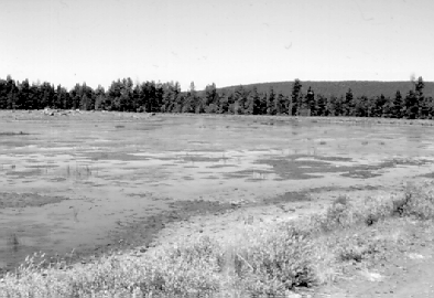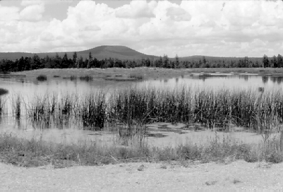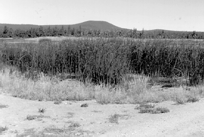 The transplanted reeds, when relocated in another pond, grew very successfully. In fact, it soon became obvious that they, especially Eleocharis, could grow fast enough to eliminate open water in several years. After the first couple of months during the summer of 1993, we ceased introducing Eleocharis into the ponds. The south end of Pond 6 shows the extensive stand of Eleocharis that developed spontaneously in three years.Typha is reputed to be a very invasive plant. When the seed heads mature, the wind may blow the seeds onto moist soil during a period of drawdown, resulting in the germination of thousands of individuals. During the three years of field work in these ponds, I have observed only one seedhead mature and that was soon destroyed by elk grazing. The elk invade these ponds and selectively graze on Typha, pulling up some stalks and keeping the others mowed down. So far, the elk have exerted a strong biological control on the cattails. | |