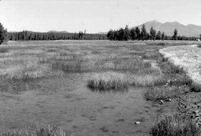| INTRODUCTION The wetland at Kachina Village, AZ, (7 mi south of Flagstaff, AZ: Map 1; Map 2) was constructed as a long-term, cost-effective way to dispose of treated effluent from that community. It began operating in 1988 with a total cost of construction of over $6 million and a capacity of 0.33 million gallons wastewater per day. After secondary treatment and chlorination, the water is pumped a mile to the eight ponds on a wind-swept mesa. The water flows by gravity from pond to pond under manual control. The system is one of winter storage and summer evaporation. |