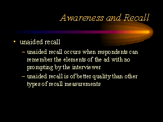unaided recall occurs when respondents can remember the elements of the ad with no prompting by the interviewer