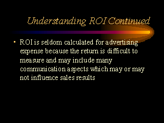 ROI is seldom calculated for advertising expense because the return is difficult to measure and may include many communication aspects which may or may not influence sales results