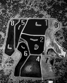 There were twelve ponds in the original design to receive effluent from the treatment plant, but only eight of these have been constructed. The two ponds on the east (Ponds 3 and 7) were dry and scheduled for repair to the berms that had been leaking. Pond 6 to the west also had a leaking berm and was scheduled for repair. The EPA permit allowed no water to leave the ponds except by evaporation.An initial survey of the ponds revealed a surprising wealth of vegetation, but little that was emergent. Ponds 1 and 2 contained chronic algal blooms but practically no other aquatic plant life. The algae was so abundant that the water was green and looked like pea soup. An examination of the water revealed that the algae were Scenedesmus. | ||||||||||||||||||||||||||||||||||||||||||